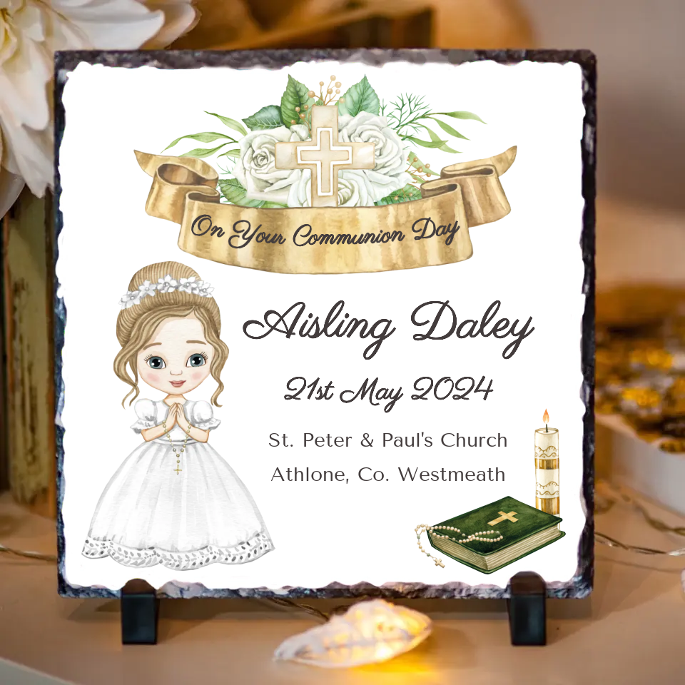 A personalised slate is a timeless and symbolic Communion gift. Customised with a beautiful image, the child's name and the date of their First Communion, this piece makes a beautiful decorative addition to their room or even the family home. Its natural stone material provides a rustic and enduring look, making it a meaningful keepsake they can cherish for years to come. The design can include a special message or prayer, adding a personal touch to this lasting memento.