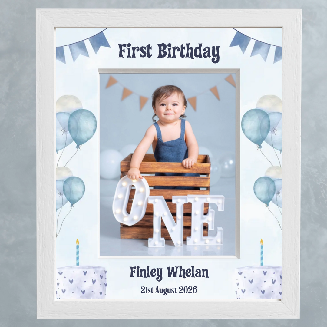 Personalised 1st Birthday Photo Frame - Balloons & Bunting Blue - Mount Customised by You!