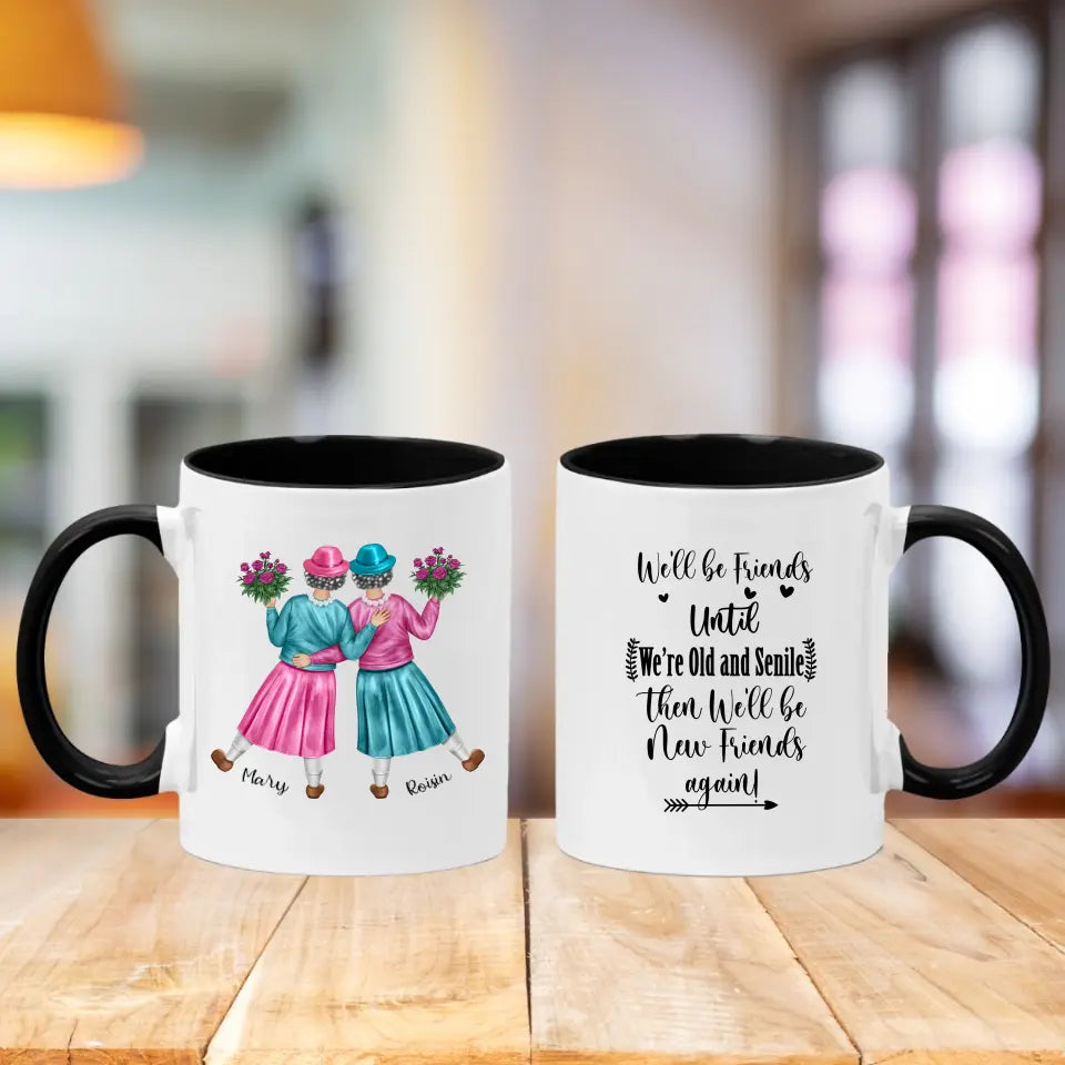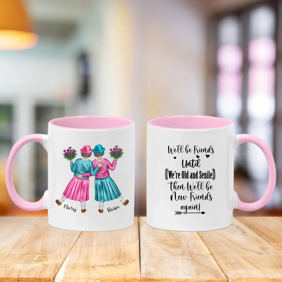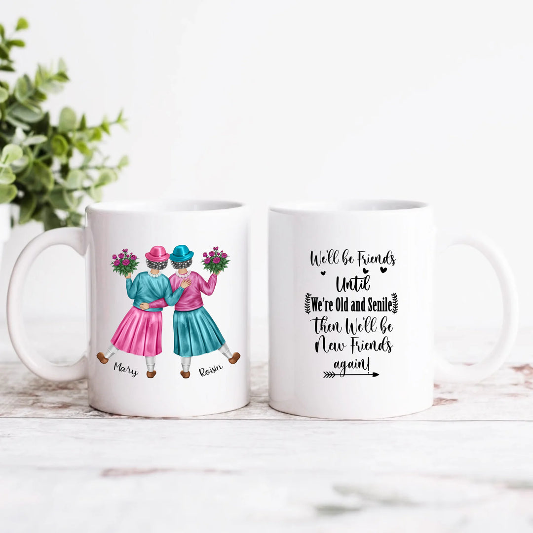 - This mug features 2 female friends, with a choice of clothes colours and accessories. Also personalised with names