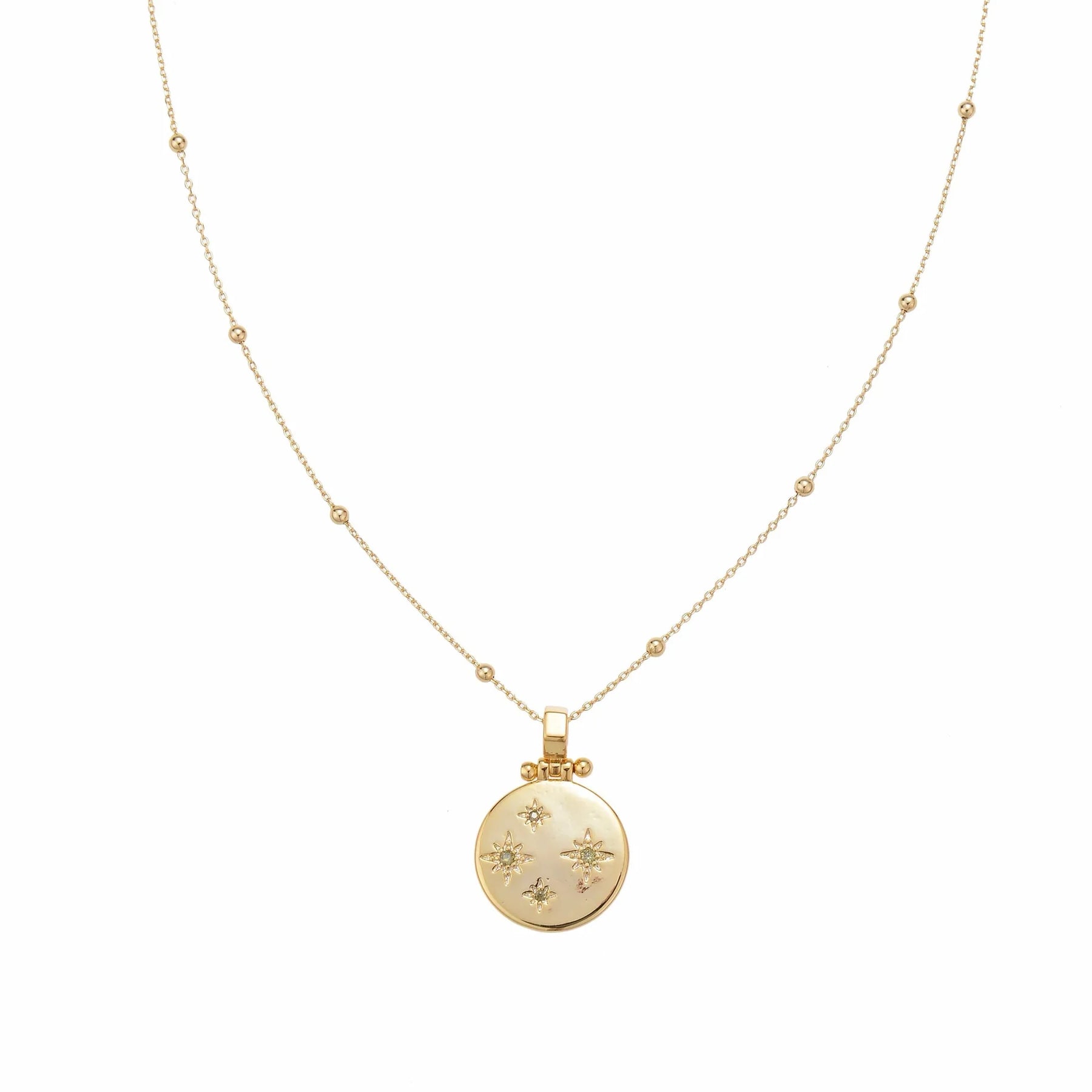 These gemstones appear clear in citrine or amber in colour and are placed on our gold disc in an arrangement representing the stars.