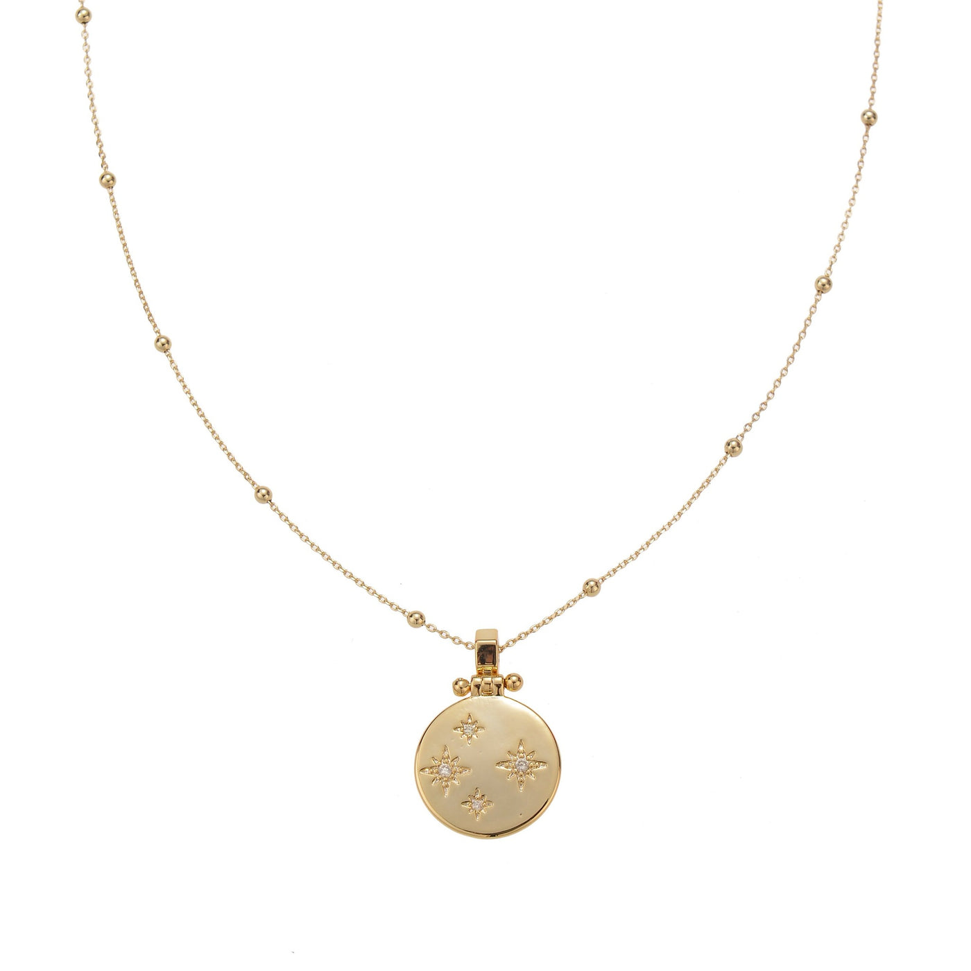 • These gemstones appear clear in colour and are placed on our gold disc in an arrangement representing the stars.