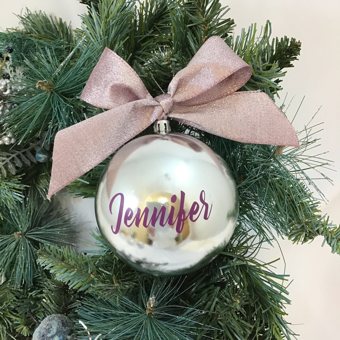 • Celebrate Christmas in style with this vibrant shiny silver bauble which is personalised with silver vinyl and finished with a luxurious white & silver ribbon!