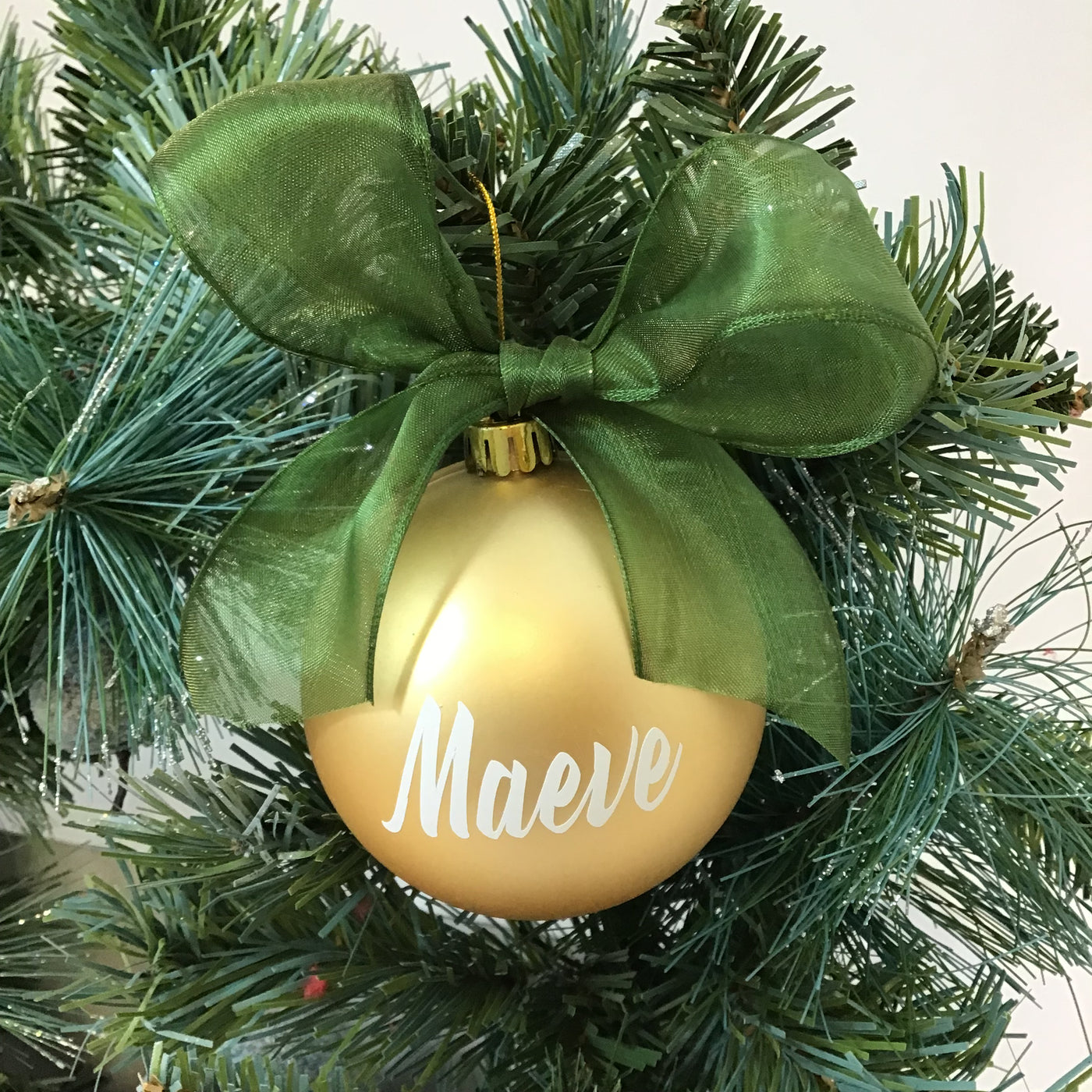 • Celebrate Christmas in style with this vibrant shiny gold bauble which is personalised with vinyl and finished with a luxurious gold glitter ribbon!