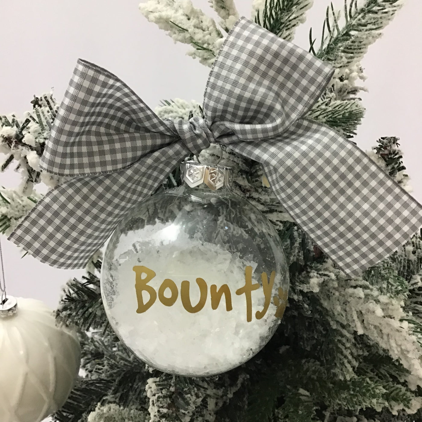 • Celebrate Christmas in style with this transparent bauble filled with snow, which is personalised with silver vinyl and finished with a grey and white check ribbon!